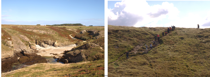 Le deuxième groupe, “les baladoux", part ¼ quart plus tard, sous la responsabilité de Katia et Annig, et emprunte le même sentier. Pour certains, cette première randonnée sur l’île se révèlera éprouvante mais avec patience et courage, ils rallient après 6,8km l’entrée du bourg de Sauzon. Là également un bus les attend pour les reconduire au VVF.